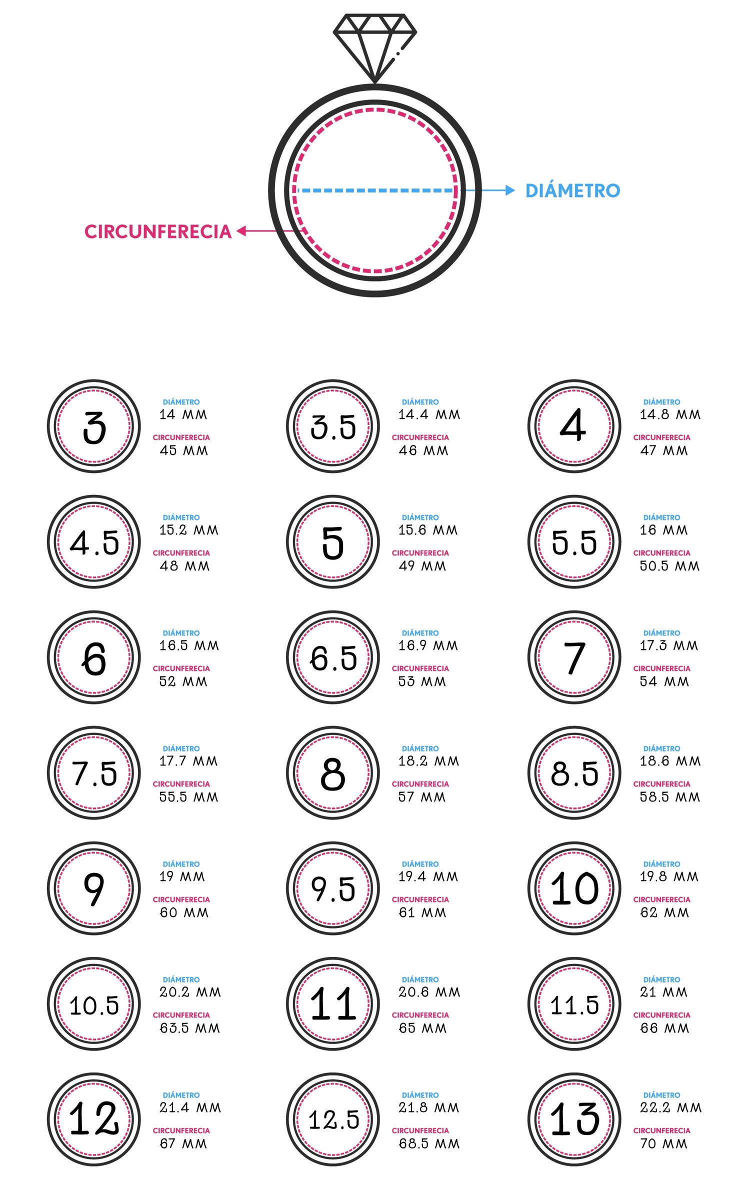 *Si ya tienes un anillo que te queda bien, puedes medir el diámetro y así saber tu talla comparando los cm con los de la tabla*